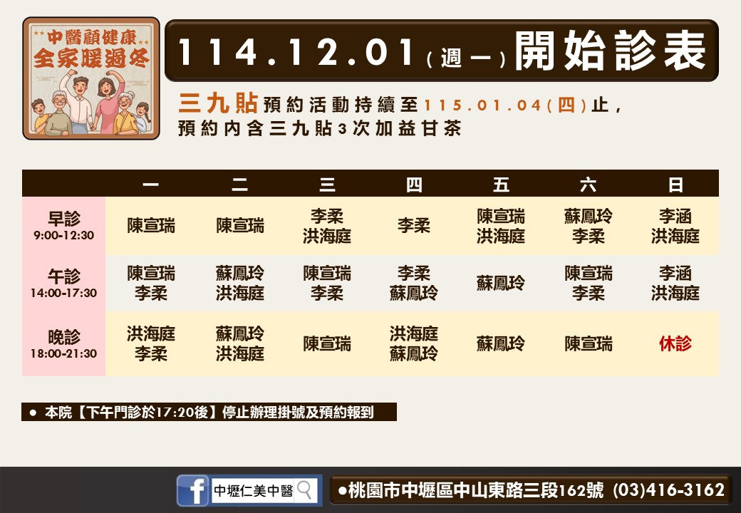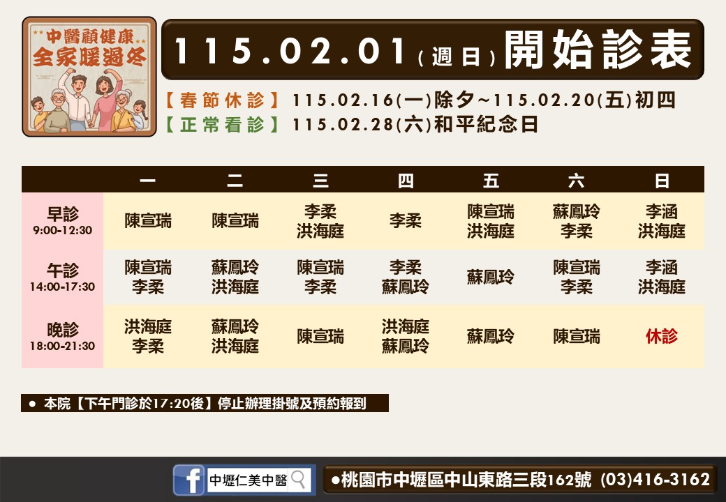 中壢仁美中醫診所,由李柔院長領軍新世代專業中醫師,秉持安心信任、精進醫術、美好生活、開創新局的經營理念,致力提供高品質且全面位的中醫醫療服務。主治項目包含內科疾病、皮膚疾患、腸胃疾病、過敏感冒、中風顏麻、痠痛針灸、減重美顏、小兒成長、助孕養胎等,全方位守護桃園在地鄉親全家人的健康!